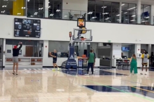 体育资讯10月7日讯 今天,印第安纳记者Tony East晒出了一段步行者球星哈利伯顿投篮训练的视频,他已经在没有任何保护措施的情况下进行了三分颠投训练。