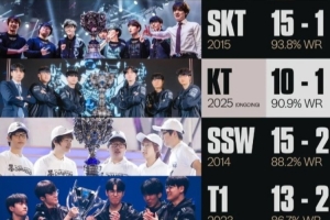 值得注意的是,KT目前10胜1负,若决赛横扫T1,KT胜率有望跻身历史第二。