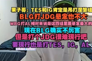 果子哥:TES和IG肯定是吊打涅槃组,BLG打JDG悬念也不大,WBG打AL相对来说是这四组里面悬念最大的,现在BLG确实不厉害,但是打个JDG很难现行吧,要现行也是打TES IG AL。