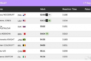 体育资讯9月17日讯 2025年东京田径世锦赛女子400米栏半决赛中,第1组的莫家蝶跑出55秒11的成绩,排名小组第七 ,无缘世锦赛女子400米栏决赛。